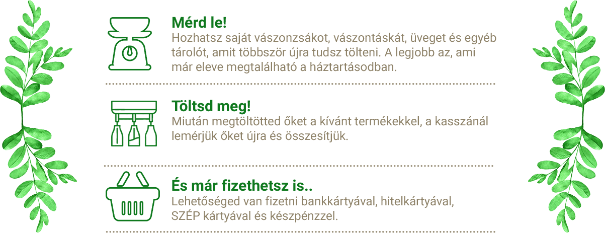 Amibe szeretnél. Az, hogy miben viszed el a kívánt árut, az teljes mértékben rád van bízva. Ez lehet vászonzsák, vászontáska, befőttes üveg, csatos üveg vagy akár viaszos kendő. Ja, és nem ördögtől való a műanyag tároló sem, amennyiben már a háztartásodban megtalálható és többször tudod használni, újratölteni. Ha nem rendelkezel semmilyen tároló edénnyel, akkor a boltban is tudsz vásárolni, melyet a következő vásárlás alkalmával újra tudsz tölteni.