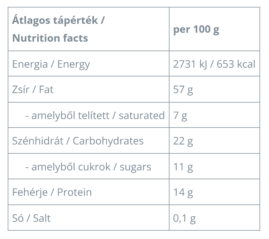 Összetevők: pörkölt törökmogyoró (85%), karamellizált fehér csokoládé (15%) (kakaóvaj, cukor, tejpor, tejcukor, fehérjepor, sovány tejpor, karamellizált cukor, emulgeálószer: szójalecitin, természetes vanília aroma, só)