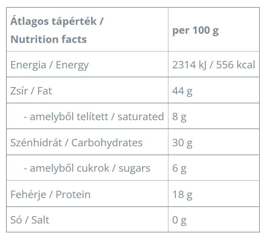 A válogatott minőségű kesudiót hozzáadott zsiradék nélkül pirítjuk, majd selymes vajjá őröljük, és ízesítjük. Semmilyen más adalékanyagot, pálmazsírt, cukrot, édesítőszert vagy emulgeálószert nem tartalmaz.